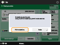 Se o item <Mostrar notificação quando trabalho for aceite> for programado para <On>, é possível aceder ao ecrã <Controlo estado/Cancelar> a partir do ecrã seguinte que é mostrado após a receção de um trabalho de envio. <Mostrar notificação quando trabalho for aceite>