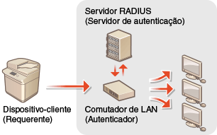 Se um dispositivo tentar estabelecer ligação e começar a comunicar numa rede 802.1X, o dispositivo tem de passar por uma autenticação de utilizador para provar que a ligação é feita por um utilizador autorizado. Os dados de autenticação são enviados e verificados por um servidor RADIUS, que permite ou rejeita a comunicação destinada à rede, dependendo do resultado da autenticação. Se a autenticação falhar, um comutador (ou um ponto de acesso) de LAN bloqueia o acesso proveniente do exterior da rede. A máquina pode estabelecer ligação a uma rede 802.1X como um dispositivo-cliente. Configurar as programações de autenticação IEEE 802.1X