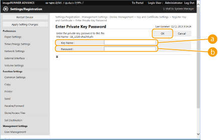 As chaves e certificados (certificados do servidor) podem ser gravadas através da Remote UI (UI Remota). Para consultar informação sobre as chaves e certificados que podem ser gravados na máquina, consulte Características técnicas do sistema.