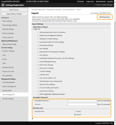 selecione o nível de segurança de [Security Level] clique em [Start Exporting]