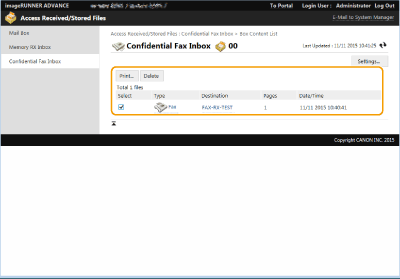 Para verificar os I-faxes que foram divididos aquando da receçãoClique em [Divided Data RX Inbox] no ecrã apresentado no passo 3 para apresentar uma lista dos I-faxes que foram divididos aquando da receção. Receber I-Faxes