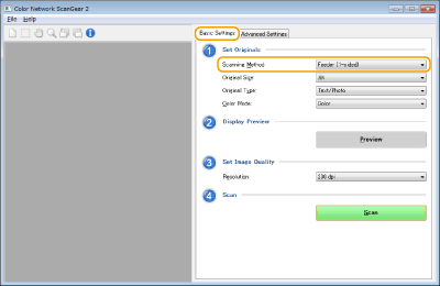 Em [Scanning Method] do separador [Basic Settings], selecione o local onde o original é colocado.