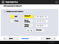 Para especificar o endereço IP manualmente, anule a seleção para <DHCP> ou <IP auto.>, carregue em <Endereço IP>, <Máscara de subrede> e <Endereço gateway> para introduzir cada valor e carregue em <Seguinte> ou <OK>.
