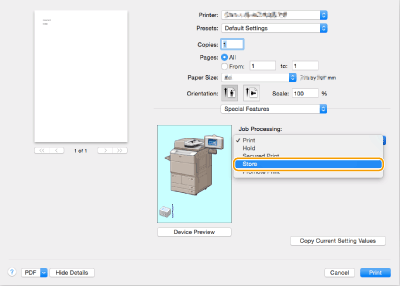 Selecione [Store] em [Job Processing] do painel [Special Features].