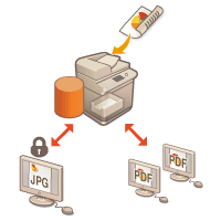 O disco rígido instalado na máquina tem um armazenamento partilhado chamado "Caixa avançada". Este espaço pode ser utilizado como um servidor de ficheiros que permite gravar documentos lidos e executar operações com os ficheiros (ver/gravar/transferir) a partir de um computador. O Caixa avançada dispõe de dois tipos de locais de armazenamento: "Espaço partilhado" que permite o acesso de vários computadores e "Espaço pessoal" que funciona como uma área de armazenamento pessoal, não aberta ao público. Utilize estes locais de armazenamento de modo diferente. Por exemplo, para os dados que pretende partilhar com a equipa do escritório, grave no "Espaço partilhado", enquanto que para dados altamente confidenciais, grave no "Espaço pessoal".