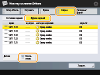 (Монитор состояния/отмена) отображается экран «Монитор состояния/Отмена», на котором можно просмотреть и распечатать историю использования каждой функции, например копирования, печати, отправки по электронной почте, отправки и получения факсов и И-факсов, сохранения файлов в «Супер-ячейка» и т.д. С этого экрана можно также распечатать историю использования каждой функции.