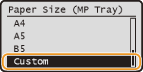 If the screen shown above is not displayed when paper is loadedIf you always load the same paper in the multi-purpose tray, you can skip the paper setting operations by registering the paper size and type as the default setting. When the default setting is registered, however, the screen shown above is not displayed. To display the screen, select <Off> for <Register Default Set.> (Registering Default Paper Settings for the Multi-Purpose Tray).
