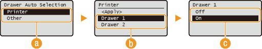Enable or disable the automatic drawer selection feature for the paper sources. If automatic drawer selection is set to <On> when printing documents, the machine automatically selects a paper source that is loaded with the appropriate paper size. Also, when the paper runs out, this setting enables continuous printing by switching from one paper source to another that is loaded with the same paper size.