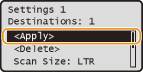 <Favorite Settings> <Edit/Delete> select the setting edit the setting <Apply> <Yes> . You cannot change the destinations registered in the setting with this procedure. Register a new setting with the desired destinations.If you want to delete a registered setting, press