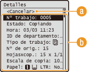 Podrá visualizar el número de copias, la configuración y otros detalles. Si solo desea consultar los detalles sin cancelar la copia, pulse