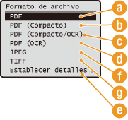 Puede elegir entre seis formatos de archivo para convertir los documentos: <PDF>, <PDF (Compacto)>, <PDF (Compacto/OCR)>, <PDF (OCR)>, <JPEG> y <TIFF>. Los documentos escaneados se convierten en el formato de archivo especificado aquí y, a continuación, se envían al destino especificado.