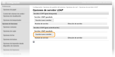 Haga clic en [Guardar nuevo servidor...] en [Servidor LDAP (para autenticación)].