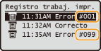 Un número de tres dígitos (código de error) aparece en un informe o en la pantalla <Monitor de estado> si se produce un error, como cuando la impresión no se realiza correctamente o la memoria está llena. Consulte la siguiente información para conocer detalles sobre las causas y soluciones de cada código de error. Para obtener más información sobre la información de los informes y cómo imprimirlos, consulte