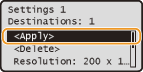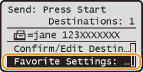 If you want to edit a registered setting, press   <Favorite Settings>    <Register/Delete>    select the setting    edit the setting    <Apply>    <Yes>  . You cannot change the destinations registered in the setting with this procedure. Register a new setting with the desired destinations.