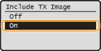 When you select <On> or <Only When Error Occurs>, a part of a fax document can be included in the report. Set <Include TX Image> to <On>, and press  .