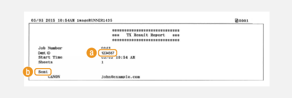 The name and address or host name of the destination are displayed. If you sent the document by e-mail, the report indicates the transmission result between the machine and the mail server, not between the machine and the destination address. A three-digit error code will not be printed, even if the transmission failed. To check the error code, print a Communication Management Report (