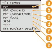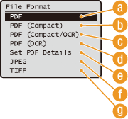 You can select from six file formats into which documents are converted: <PDF>, <PDF (Compact)>, <PDF (Compact/OCR)>, <PDF (OCR)>, <JPEG>, and <TIFF>. Scanned documents are converted into the file format specified here, and then sent to the specified destination.