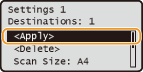 <Favorite Settings> <Edit/Delete> select the setting edit the setting <Apply> <Yes> . You cannot change the destinations registered in the setting with this procedure. Register a new setting with the desired destinations.If you want to delete a registered setting, press