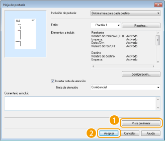 Muestra los elementos que van a incluirse en una hoja de portada. Para cambiar los elementos que desee incluir, haga clic en [Configuración].