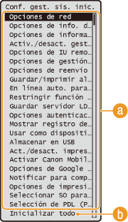 Lista del menú de configuración). En el caso de algunas opciones, deberá reiniciar el equipo para completar la inicialización.