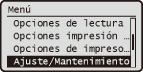 Todas las opciones sobre el ajuste y el mantenimiento se muestran con descripciones breves. Las opciones predeterminadas aparecen marcadas con una cruz (