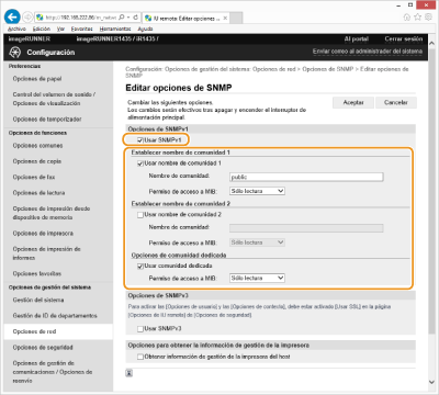 Seleccione la casilla de verificación [Usar nombre de comunidad 1] o [Usar nombre de comunidad 2], introduzca el nombre de la comunidad en el cuadro de texto [Nombre de comunidad:] y especifique la opción [Permiso de acceso a MIB].