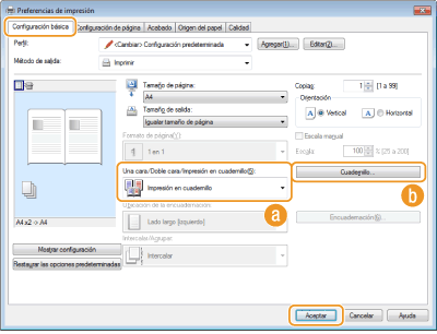 Seleccione [Impresión en cuadernillo] en [Una cara/Doble cara/Impresión en cuadernillo]