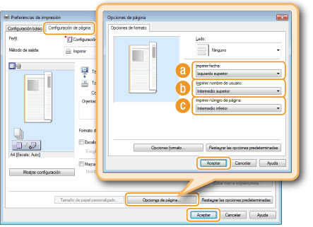 Seleccione la posición de impresión de la fecha de impresión, el nombre de usuario o el número de página