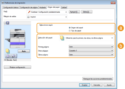 Pestaña [Origen del papel] Seleccione [Origen del papel] en [Seleccionar según] Seleccione el origen del papel cargado con el papel en el que desea imprimir en [Origen del papel] [Aceptar]