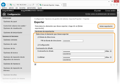 Introduzca hasta 32 caracteres alfanuméricos para la contraseña cifrada. Para la confirmación, introduzca la misma contraseña en el cuadro de texto [Confirmar:]. Esta contraseña será necesaria para importar los datos en el equipo.