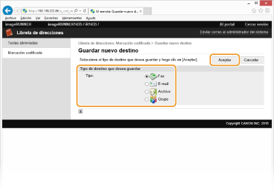 Seleccione el tipo de destino y haga clic en [Aceptar].