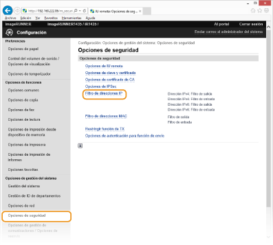 Comprobación de los errores de entrada Si las direcciones IP se introducen de forma incorrecta, es posible que no pueda acceder al equipo desde la IU remota, en cuyo caso deberá establecer <Filtro de direcciones IPv4> o <Filtro de direcciones IPv6> en <Off>. Filtro de direcciones IPv4 Filtro de direcciones IPv6