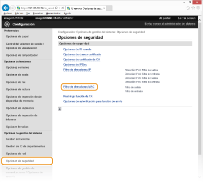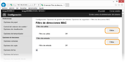 Comprobación de los errores de entrada Si las direcciones MAC se introducen de forma incorrecta, es posible que no pueda acceder al equipo desde la IU remota, en cuyo caso deberá establecer <Filtro de direcciones MAC> en <Off>. Filtro de direcciones MAC