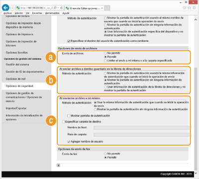 Si se selecciona [Permitir] en [Envío de archivos:], haga clic en el botón de opción para especificar cómo se autenticarán los usuarios en el servidor de archivos seleccionado en la libreta de direcciones.