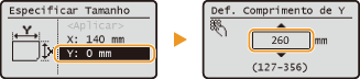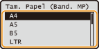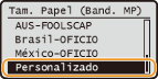 Se a tela mostrada acima não for exibida quando o papel for carregadoSe você carrega sempre o mesmo papel na bandeja multiuso, você pode ignorar as operações de configuração de papel registrando o tamanho e o tipo de papel como a configuração padrão. Quando a configuração padrão é registrada, entretanto, a tela mostrada acima não é exibida. Para visualizar a tela, selecione <Desativado> para <Reg. Config. Padrão> (Registrando as Configurações de Papel Padrão para a Bandeja Multiuso).