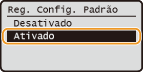 Depois que a configuração de papel padrão é registrada, a tela de configuração de papel não é exibida quando o papel é carregado, e a mesma configuração é usada. Se você carregar um tamanho ou tipo de papel diferente, a máquina pode não imprimir adequadamente. Para evitar este problema, desabilite a configuração padrão selecionando <Desativado> na etapa 3 e depois carregue o papel.