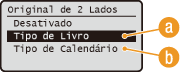 Selecione <Tipo de Livro> ou <Tipo de Calendário>