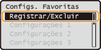 <Configurações Favoritas> <Registrar/Excluir> selecione a configuração <Excluir> <Sim> .As configurações registradas são salvas mesmo quando a máquina está DESLIGADA.