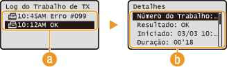.![]() <Log do Trabalho de TX>/<Log do Trabalho de RX>Exibe uma lista de documentos que foram enviados e recebidos. <OK> é exibido quando um documento foi enviado ou recebido com sucesso, e <Erro> é exibido quando um documento falhou ao ser enviado ou recebido pois foi cancelado ou ocorreu um erro.