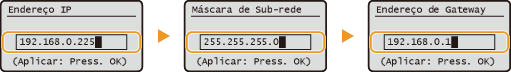 <Máscara de Sub-rede> <Endereço de Gateway>.Digite definição usando o teclado numérico e pressione