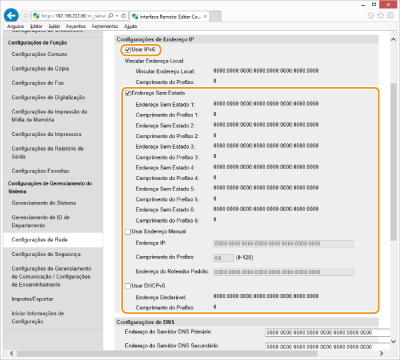 Os endereços IPv6 da máquina podem ser configurados através da IU remota. Antes de definir os endereços IPv6, verifique as definições do endereço IPv4 (Visualizando as definições IPv4). Observe que a função de digitalização que usar o driver do scanner não está disponível em um ambiente IPv6. Você precisa definir as definições IPv4 corretas para usar endereços IPv6. A máquina pode usar até nove dos segundos endereços IPv6: