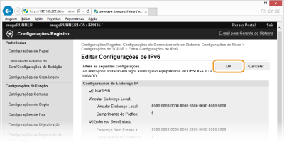 Verificando se as definições estão corretasCertifique-se de que a tela de IU remota possa ser exibida com o seu computador ao usar o endereço IPv6 da máquina. Iniciando a IU remota
