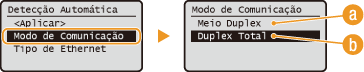 selecione <Meio Duplex> ou <Duplex Total> .![]() <Meio Duplex>Envia e recebe dados de comunicação de forma alternativa. Selecione-a quando a máquina estiver conectada a um dispositivo de rede usando half duplex.