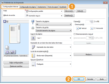 Clique nas guias [Configurações básicas], [Configuração de página], [Acabamento] [Fonte de papel] ou [Qualidade] para especificar as configurações de impressão em cada tela conforme o necessário.