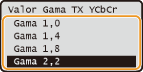 Você pode especificar o valor gama aplicado quando os documentos são digitalizados no formato de arquivo que você especificou (Selecionando um formato de arquivo). Você pode especificar os mesmos valores de gama que o valor do monitor que será usado para visualizar os arquivos convertidos para que estes arquivos sejam exibidos com o brilho fiel aos documentos originais.