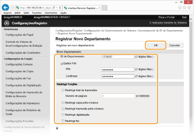 Para definir um PIN, selecione a caixa de verificação e digite um número de até sete dígitos no [PIN:] e nas caixas de texto [Confirmar:]. [Restringir Funções:]