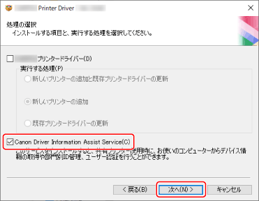 ドライバーの選択を解除 → [Canon Driver Information Assist Service]を選択 → [次へ]をクリック