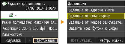 Ако във вашия офис е инсталиран LDAP сървър, можете да използвате дестинациите, запаметени в сървъра. За да зададете дестинации, влезте в LDAP сървъра чрез устройството и потърсете дестинация.