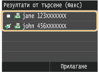 Лични имена, номера на факс, имейл адреси, имена на организации и имена на отдели са наличните критерии за търсене на дестинации. Могат да бъдат зададени едновременно множество критерии за търсене.
