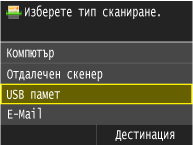 Ако в дадена папка от USB паметта се намират много файлове, запаметяването на сканирани данни ще отнеме повече време. Изтрийте ненужните файлове от USB паметта или ги преместете в друга папка чрез компютъра си.